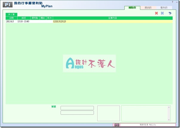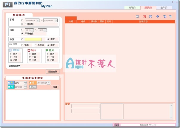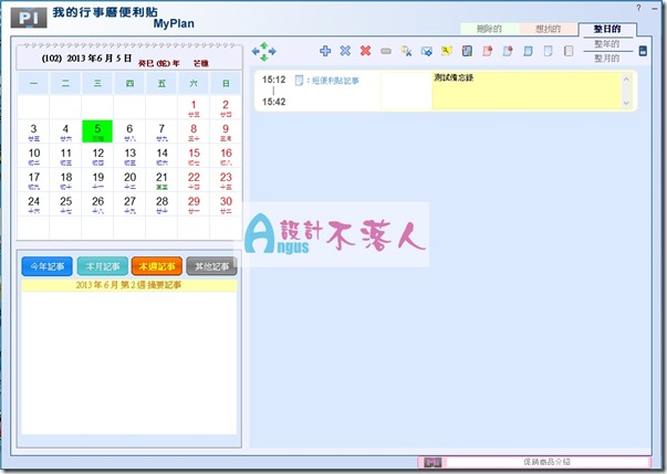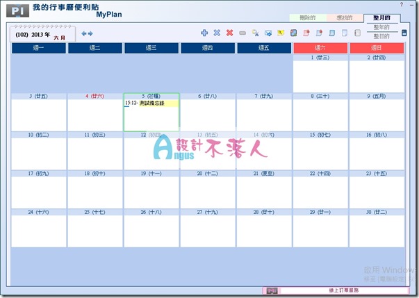 還在為自己的一整天、整月或整年的事情安排煩惱嗎?如果忘記了重要的客戶那將會是一場災難,MyPlan這套軟體可以輕鬆的管理自己的行事曆,不管是事件提醒或者已經完成的事件都可以搜尋的回來,對於不太會如何規劃自己的行程的人是一套相當實用的一套小軟體,最近Angus也經常專注於一件事情上卻忘記了時間該做的一些事情,讓很多事情都往後延期了,當然有免費的行事曆軟體可以使用又有相當多的附加功能可以使用,那應該沒有理由不去使用吧!雖然還是有相當多的軟體行事曆可以讓大家使用,但是MyPlan各方面的表現是讓Angus會想去嘗試使用的一套行事曆軟體。