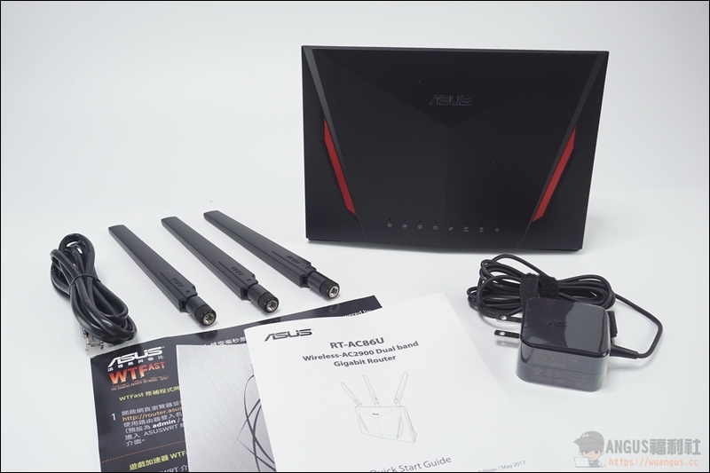 ▼ 所有內容物包括 : RT-AC86U 路由器*1、外拆式雙頻天線*3、變壓器*1、網路線*1、說明書*1、WTFast DM*1。
