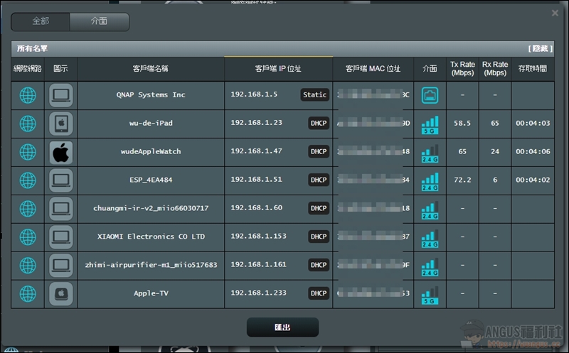 ▼ 玩家可以清楚的透過設備清單看到家中所有連網的設備,不管是透過實體網路還是 2.4G/5G 無線網路,都可以清楚的知道是什麼手機、電腦、NAS、Apple TV等等…,所以在管理網路設備上可以清楚掌控,而家長們清楚這些IP與MAC位置後,就可以透過家長限制來控管小朋友上網時間與瀏覽的網頁,相當值得推薦的功能。