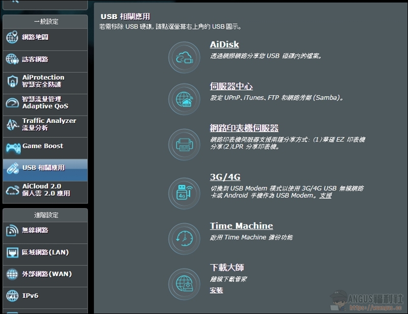 ▼ 透過USB設備可以運用的功能也相當多,伺服器、網路印表機伺服器、3G/4G網路、Time Machine備份、下載軟體…等等,簡單來說就是一台簡易的 NAS 功能囉。