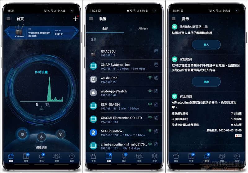 ▼ 透過「華碩路由器」APP軟體,可以直接遠端操作監看家中的路由器,就跟網頁版一樣可以查看所有設備,也可以設定家長監控,所有的設備連線資訊都相當清楚,就算家長不在家也可以查看小朋友上網的資訊。