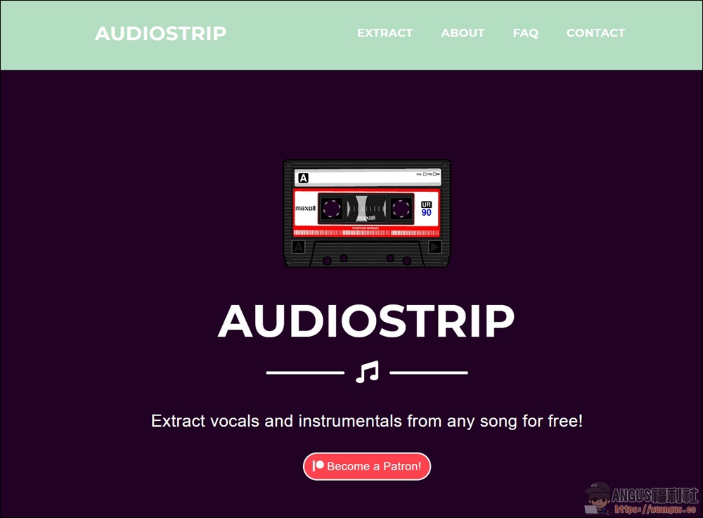 首先進入 AudioStrip 官方平台後,就可以看到一個可愛的卡帶圖示,標題就寫著 AUDIOSTRIP 去除人聲的功能說明。