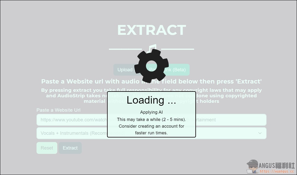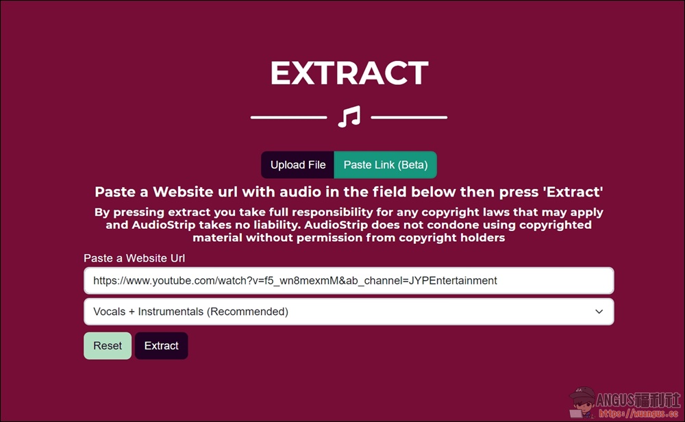 移動到頁面下方後,就會進入 EXTRACT 區塊,使用者可以選擇「Upload File」上傳自己想要移除人聲的影片或「Paste Link」輸入想要下載最新MV歌曲的 Youtube 連結,再按下「Extract」就可以一鍵進行人聲跟音樂分離的 Ai 技術了。