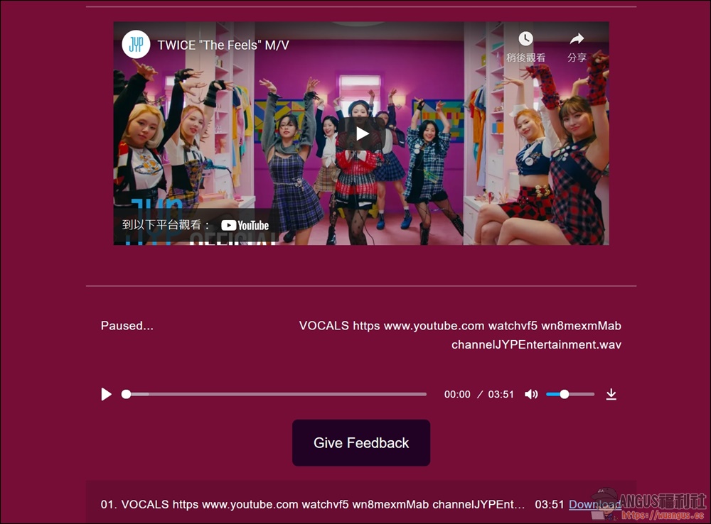 製作完成後,可以馬上預覽影片效果,下方有兩個檔案可以撥放,第一個是伴奏音樂,第二個是分離出來的純人聲音,最後如果想要下載的話,點擊右邊的「Download」就會開始下載,這樣製作家裡的卡拉OK環境就相當簡單,大家就快點去嘗試看看吧。