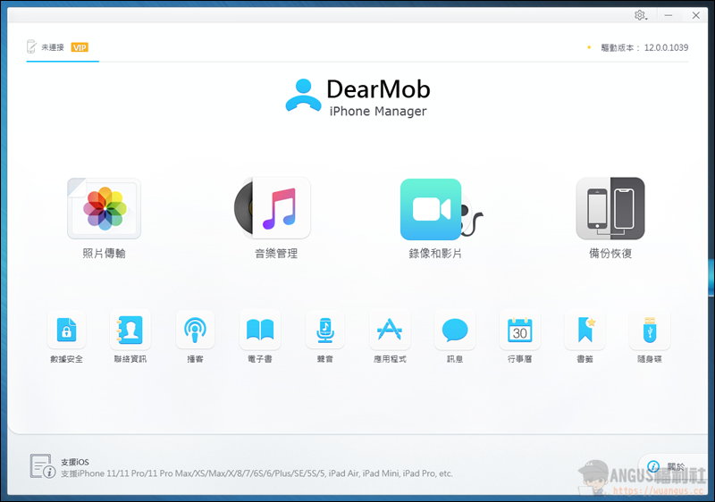 ▼ 進入 DearMob iPhone Manager首頁時,可以看到主要的四大功能,照片傳輸、音樂管理、4K影片管理、備份/還原,而介面上跟先前介紹過的 iTools 工具有些類似,下方也有非常多小功能可以管理自己的 iOS 系統,傳輸、備份、加密、轉檔都超簡單操作的。
