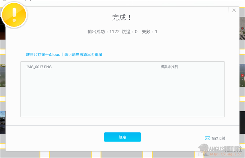 ▼ 匯出過程也會顯示成功輸出多少張照片,失敗有多少,可以清楚知道沒有成功的照片檔名。