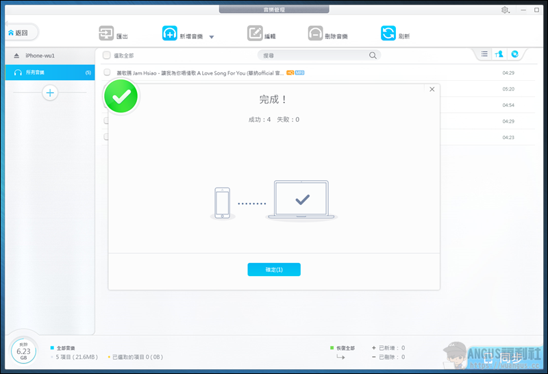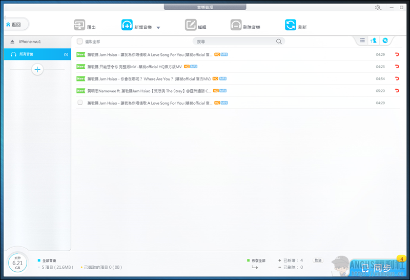 ▼ 超多用戶更本不知道該如何將 MP3 音樂格式匯入到 iOS 系統裡,也不知道該如何轉擋才能在手機上加入 MP3 音樂,藉由音樂管理的功能,可以直接新增音樂到列表中,按下右下角的同步,即可同步至手機內。