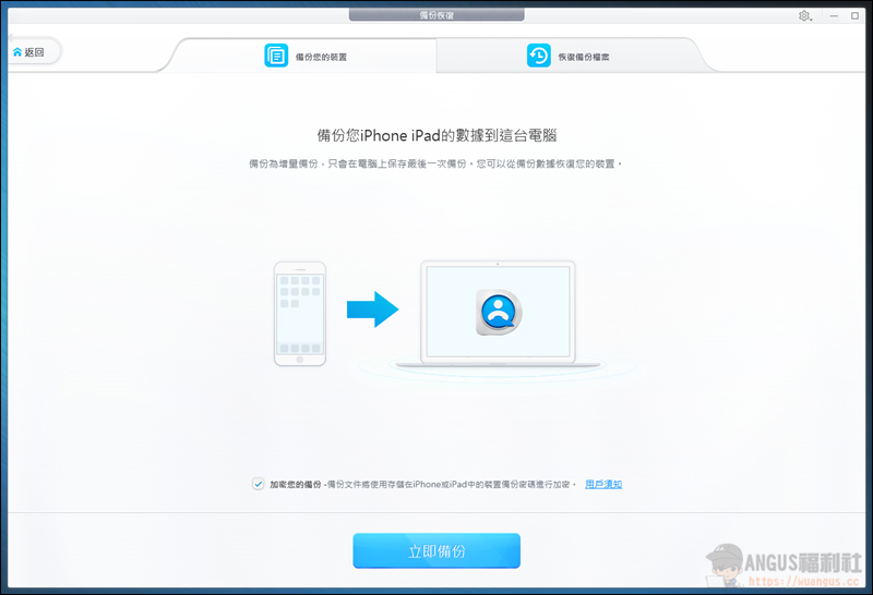 ▼ 很多老用戶都知道官方的 iTunes 備份軟體相當難使用,在備份與還原過程中很容易會有不明的錯誤,透過 DearMob iPhone Manager來備份手機資料,操作上變的更簡單方便,直接點選下方的「立即備份」即可。