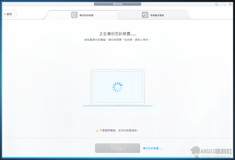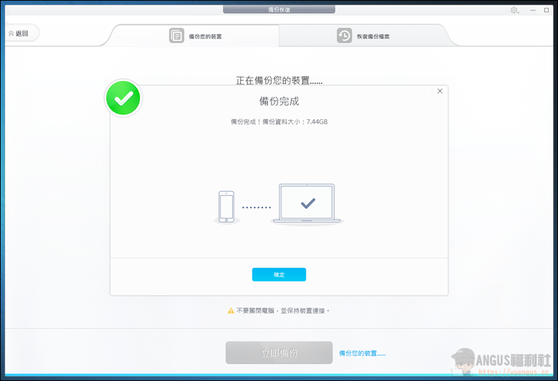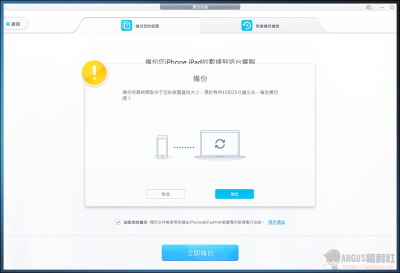 ▼ 備份的過程中會等待15-25分鐘左右,所以請耐心等待備份的過程,按下「確定」後,就會開始進行iOS設備的備份。