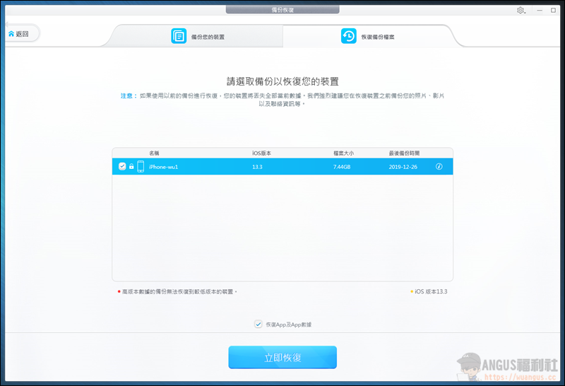 ▼ 當要恢復備份資料時,也可以切換至恢復您的備份管理頁面中,直接選擇要恢復的備份檔案。