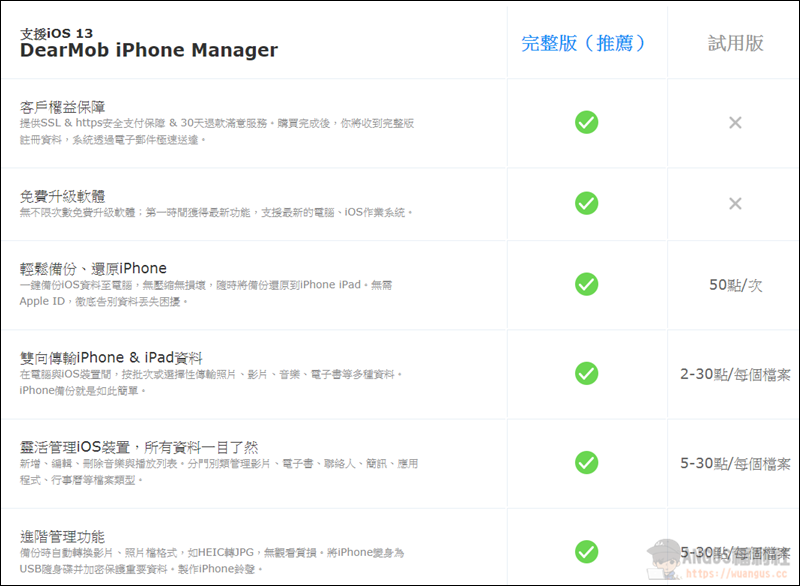 ▼ 試用版與完整版差異在於可以無限制將 iOS 設備資料備份、管理、匯出/匯入。