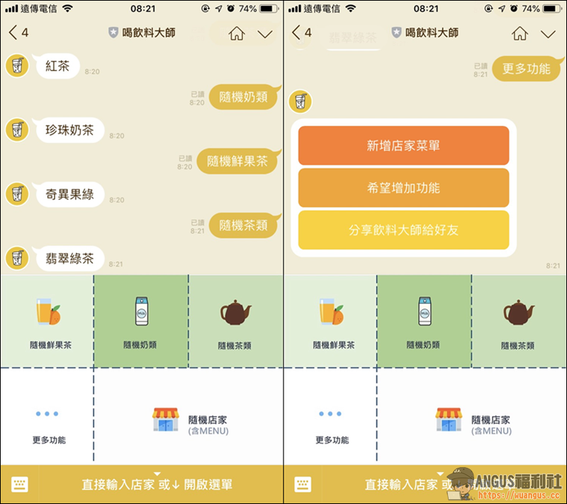 ▼ 首先加入喝飲料大師好友,就可以進入主聊天室視窗,下方會有隨機「鮮果茶」、「奶類」、「茶類」可以選擇,只要大家按下隨機項目就會自動回覆給你隨機的飲料品名,再也不用特別花時間想自己要喝什麼飲料,而且隨機的好處也可以跳脫自己每次喝的那幾種飲品,偶而還會發現更多不一樣又好喝的飲料,另外如果覺得機器人的內容不夠完整或想要新增菜單,可以按下「更多功能」來完成回報哦。