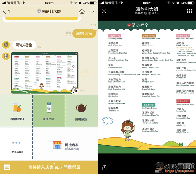 ▼ 選擇「隨機店家」功能,機器人會隨機分享全台所有手搖飲料店的最新菜單,不用再透過上網搜尋來找店家的資訊內容,只要打開LINE回傳中的照片就可以馬上看到完整的飲料菜單。