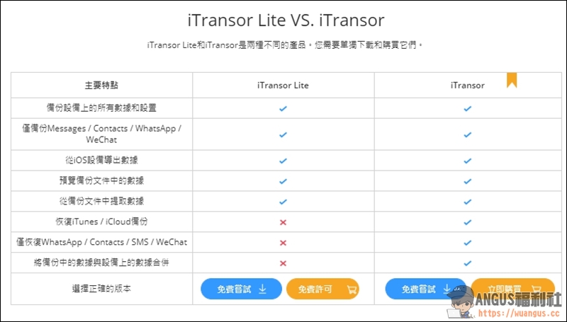 ▼ 這次免費取得序號為 iMyFone iTransor Lite 版,此序號無法在 iTransor 版上使用,因為專業版還是有功能上的差異,透過表格就可以很清楚的了解。