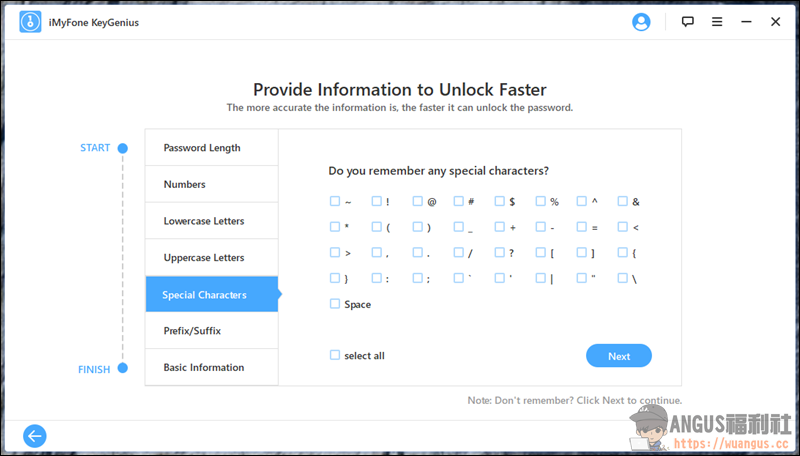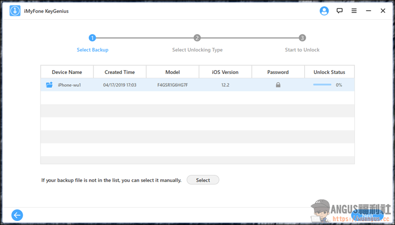 ▼ 接下來系統就會自動抓取電腦上 iTunes 的備份檔紀錄,選擇好要破解的備份檔案後,就可以點選「Next」繼續下一步。