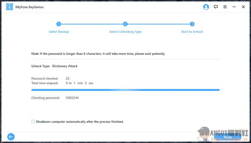注意:iMyFone KeyGenius 解鎖所需時間取決於密碼本身的長度及複雜程度,如果密碼過於複雜,則很可能無法解鎖。