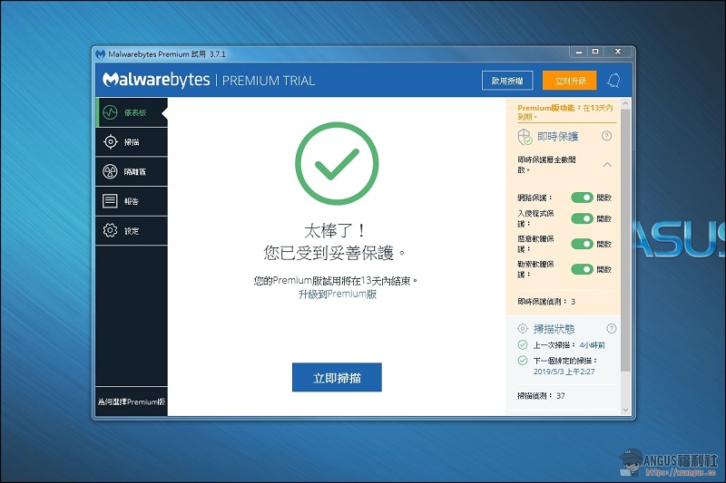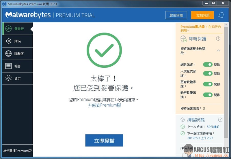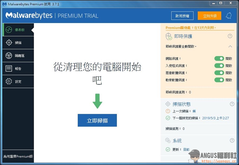 使用者可以從官方 Malwarebytes 網站下載軟體試用,下載安裝完成後,即可開始按下「立即掃描」功能。