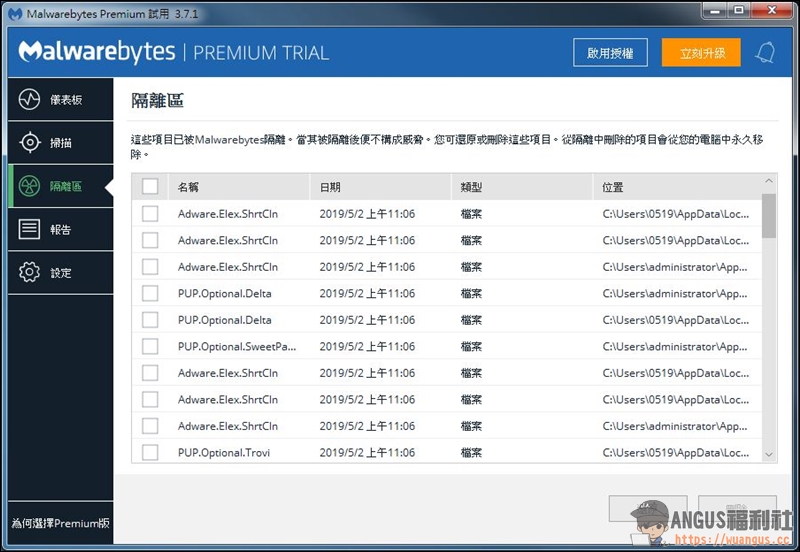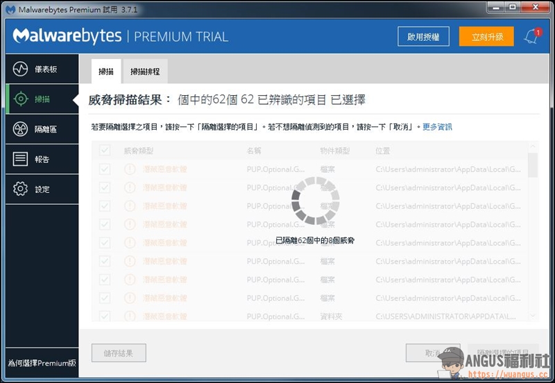 ▼ 掃描完成後會顯示目前威脅結果,勾選想要清除隔離的威脅後按下「隔離」即會開始執行。