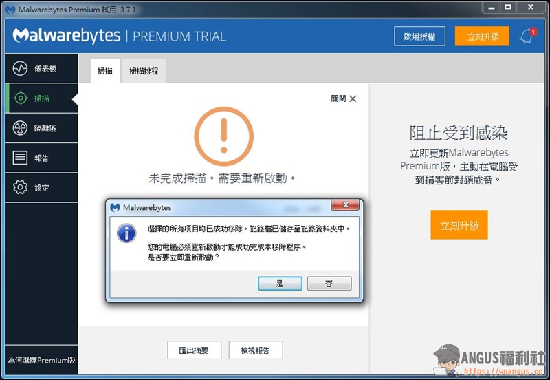 ▼ 最後隔離病毒後必需先重新啟動電腦,才算真的完成清除。