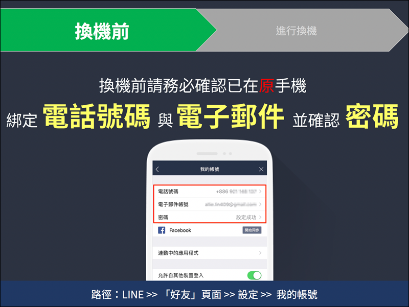 ▼ 首先進入LINE >「好友」頁面 >「設定」 >「我的帳號」,將「電話號碼」與「電子信箱」綁定,建議所有用戶再換機前都再次確認自己的電子信箱帳號、密碼,避免忘記哦。