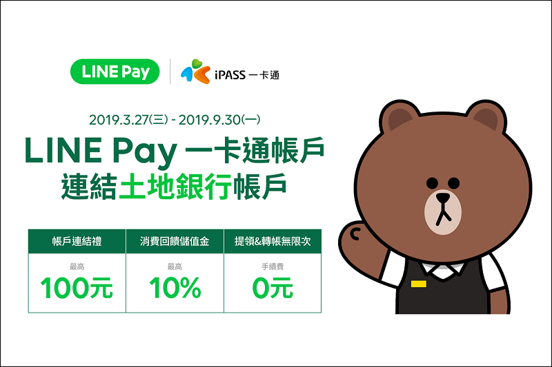 - 新戶禮:LINE Pay一卡通帳戶連結土地銀行帳戶,並開啟自動儲值功能,即享LINE Pay一卡通帳戶儲值金100元