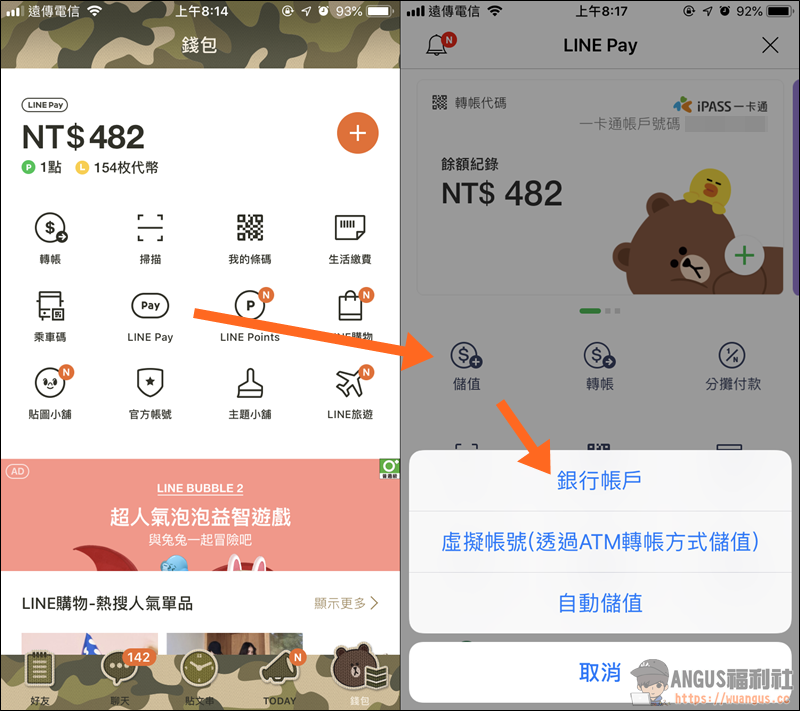 ▼ 首先進入手機LINE錢包後點選「LINE Pay」>「儲值」>「銀行帳戶」。