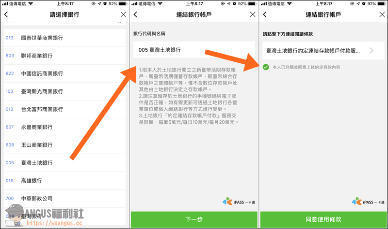 ▼ 選擇要連結的「銀行」>「連結銀行帳戶」>「同意使用條款」,這次A編使用土地銀行來測試教學。