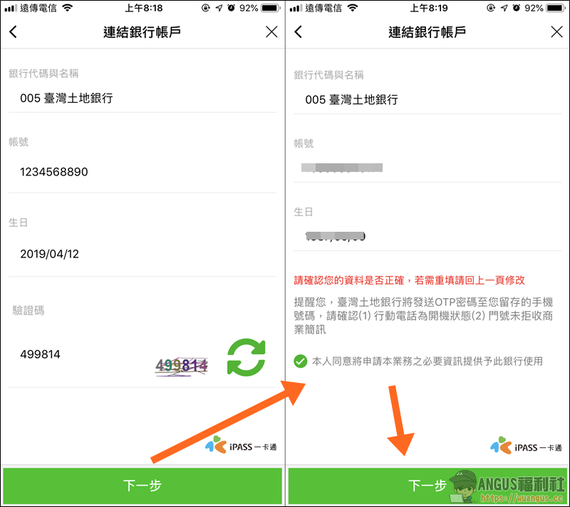 ▼ 在連結銀行帳戶視窗中請輸入「戶頭帳號」、「生日」、「驗證碼」,確認並勾選同意申請後,就可以繼續下一步驟的流程。