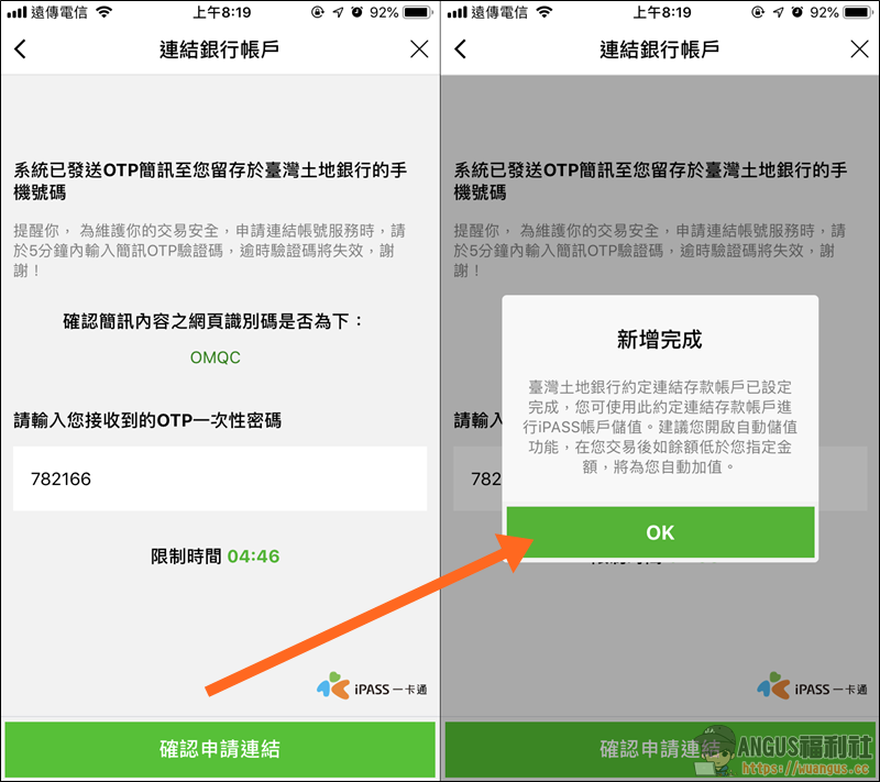 ▼ 連結銀行帳戶時會透過 OTP簡訊 驗證的方式核對身份,在手機收到密碼後輸入在視窗中的欄位上,即可按下「確認申請連結」來完成綁定,當最後成功後也會跳出「新增完成」的提示,按下OK即可。