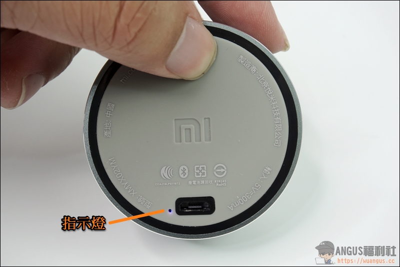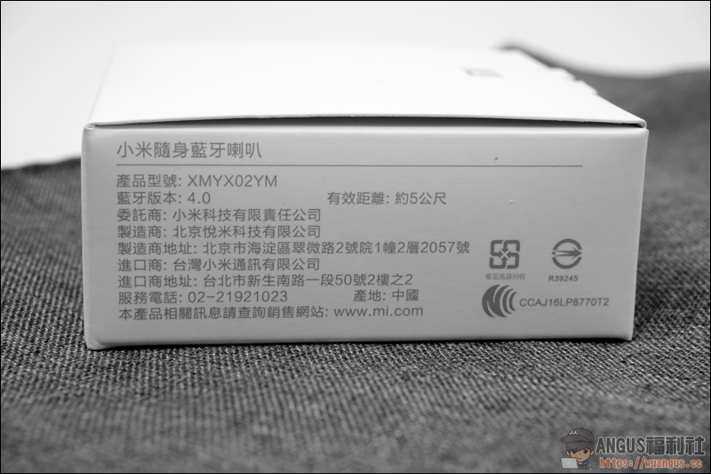 ▼ 側邊則是產品的型號、藍芽版本、製造商、產地等資訊,而小米藍芽喇叭的有效距離約5公尺,其實如果中間有多一道牆好像就有點斷訊出現,不過基本上也是攜帶在身上使用,並不會拿太遠使用,所以也不用太過於擔心這個問題。