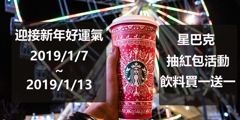 2019年 星巴克迎接新年好運氣 第一次的優惠抽獎活動,只要在1/7-1/13日期間,每日皆可至數位活動畫面開啟當日送出的紅包,即可獲得新年專屬優惠,憑優惠券可至全台星巴克門市使用相關優惠,如果當日活動沒有抽到買一送一活動,但是別灰心,隔日還是可以在登入帳號來抽新年紅包,兌換飲料時只需要示出手機數位畫面供門市夥伴蓋章即可,快點把握機會吧!