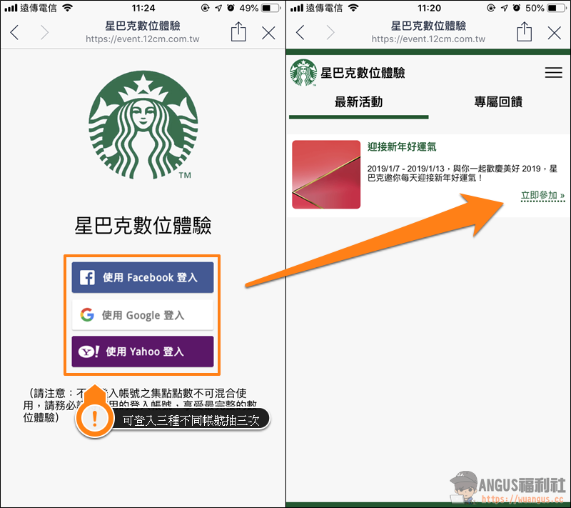 ▼ 進入活動網址後,可以選擇三種登入方式,每一種帳號登入就可以免費抽一次,也就是說每一個帳號每一天都有一次登入抽獎的機會,登入帳號後點選「迎接新年好運氣」即可進入活動。
