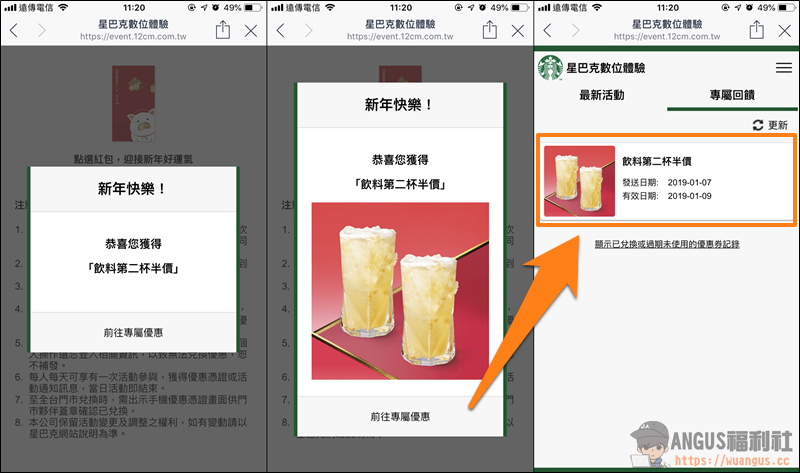 ▼ 如果有中獎就會出現「新年快樂」的字樣,這次小編抽中的是「飲料第二杯半價」,當活動抽中獎後點選畫面中的「專屬回饋」即可顯示兌換條碼。