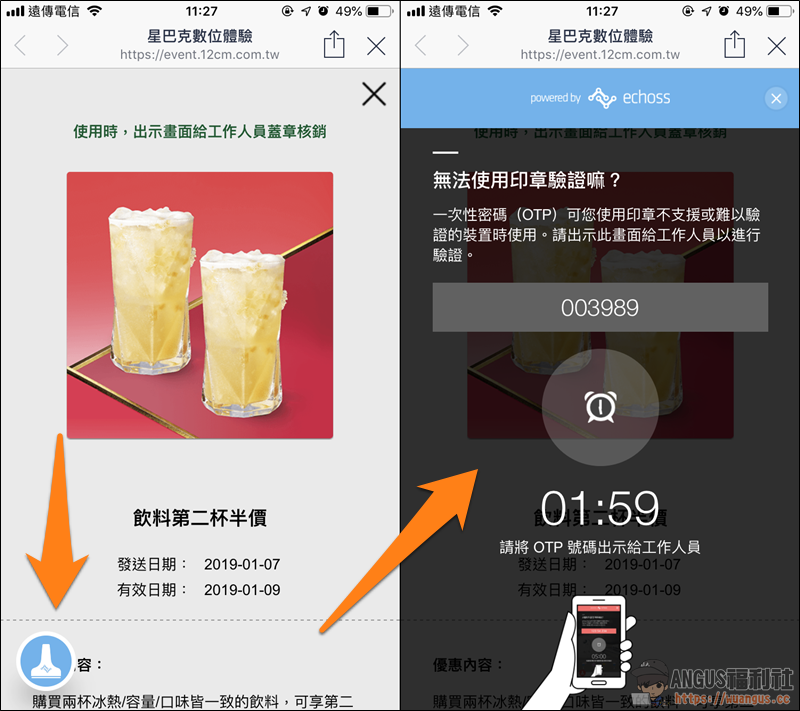 ▼ 只要出示中獎畫面下方的QR碼即可馬上跟全省星巴克門市兌換商品或飲料,該優惠取得日2天內(例如:1/7取得優惠,兌換截止日為1/09),如果無法使用印章驗證,可以透過一次性密碼(OTP)出示給工作人員哦。
