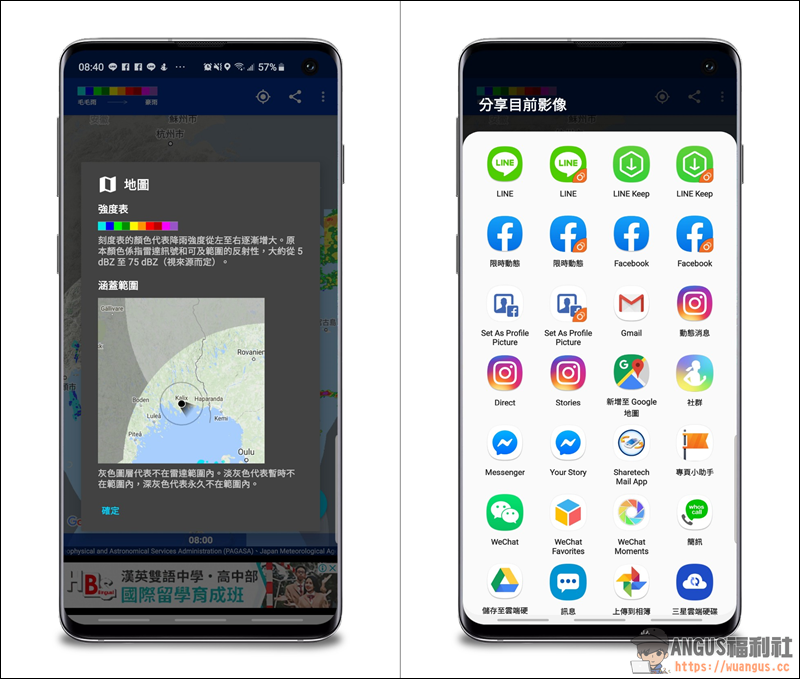 ▼ 在地圖上刻度顏色代表降雨強度,顏色越偏向紅紫色就代表降雨機率高,當然大家也可以透過這款APP分享目前的畫面給 LINE 或 Facebook 上的朋友哦。