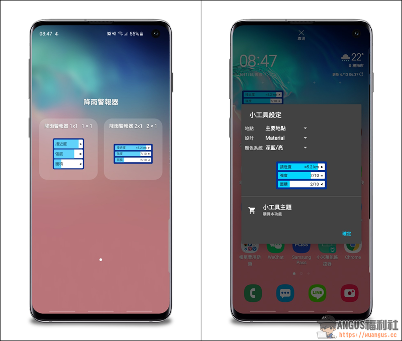 ▼ 當然可以將「降雨警報器」加入在手機主畫面上,有兩種不同的警報小工具可以選用,上方也會有提示降雨前的警報資訊哦。