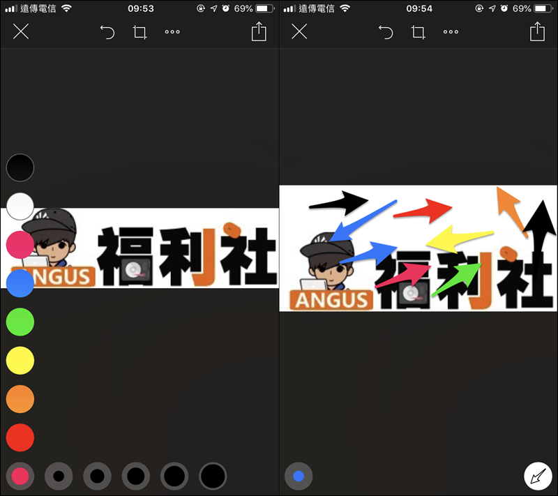 ▼ 當然使用各種以上不同的工具時,當然不只是一種顏色而已,還有非常多種顏色可以選擇,剩至還可以選擇筆畫的粗細度,讓照片可以標註的更完美。