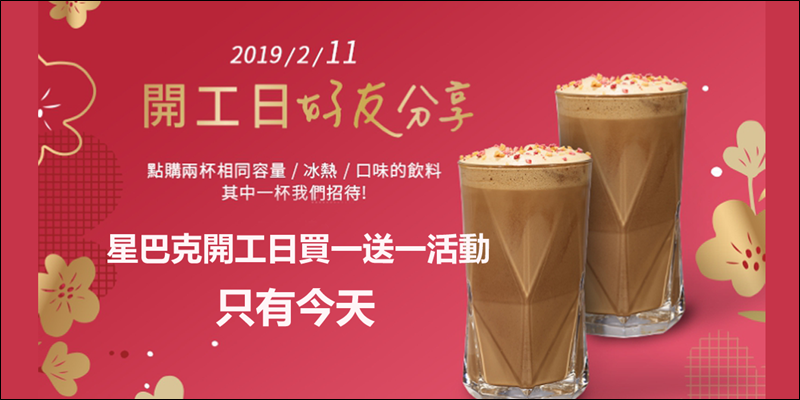 新的一年準備開始開工上班,大家一定都會有點懶或心情不佳,所以星巴克也推出了開工日活動,讓開工上班的朋友們也有一點小確幸,而開工日活動只到今天2019/02/11(ㄧ)早上開店至晚上20:00活動就結束,新的ㄧ年快點先從喝星巴克開始享受,所以想要參加活動的朋友們,快點把握機會購買星巴克買一送一的活動,讓上班心情愉快一些吧。