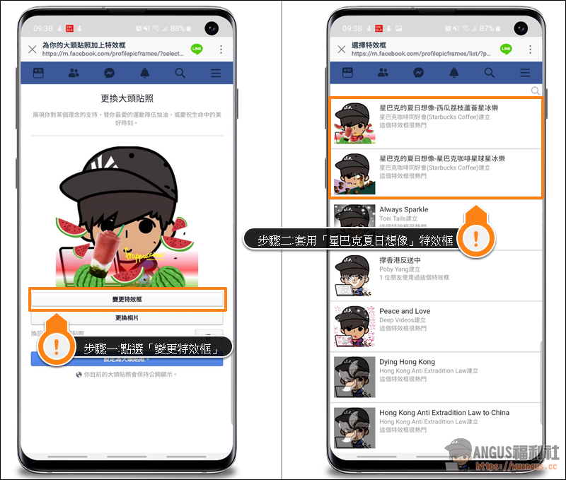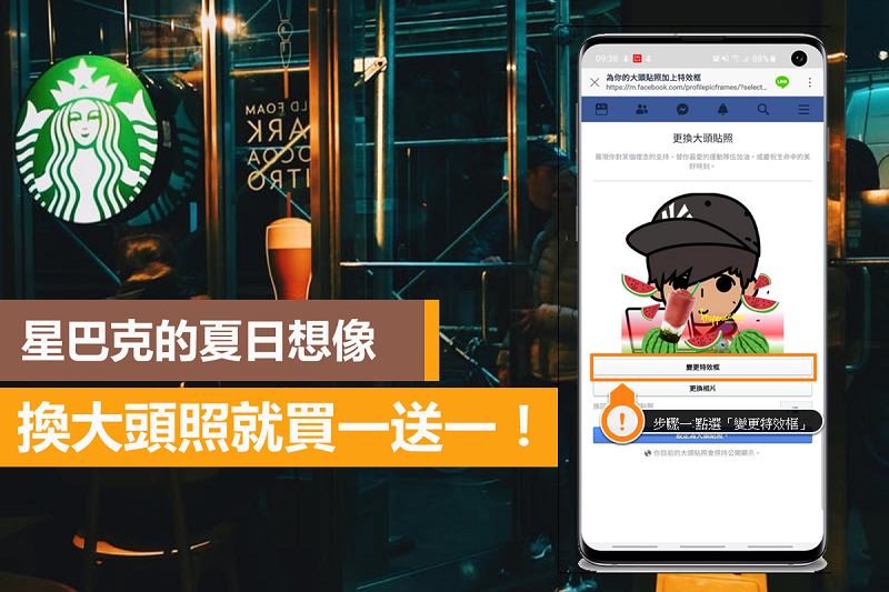 - 步驟一:進入星巴克特效框專屬連結,登入Facebook後,點選「變更特效框」。
