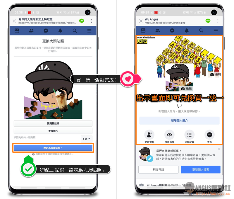 - 步驟三:點選「設定為大頭貼照」,即可完成買一送一活動,並且出示畫面即可兌換買一送一。
