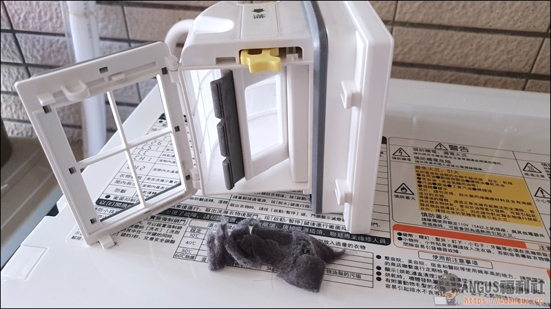 ▼ 如果想要清潔烘乾濾盒的毛屑雜物,只要推壓旁邊的黃色清潔設計,就可以一鍵清潔完成。