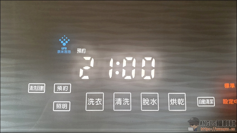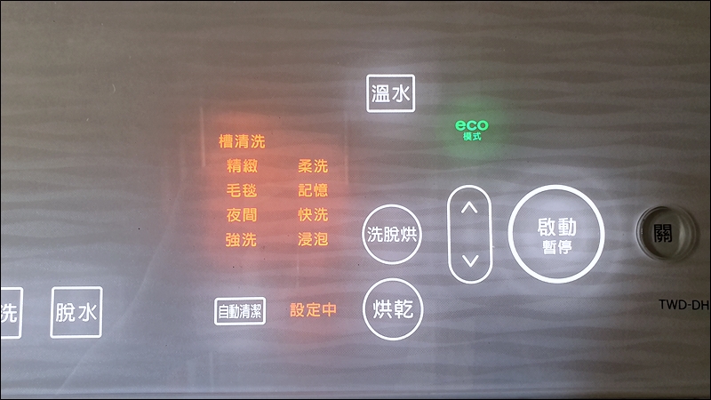▼ 開起電源後就可以看到面板的LED燈亮起,上方有相當多的功能與資訊,在操作上相當有科技感,不需要按壓選擇功能,只要輕輕觸控點選即操作,就像使用智慧型手機一樣方便,主要分為溫水、洗衣、洗脫烘、烘乾四大功能,後面還會有更詳細的功能測試。