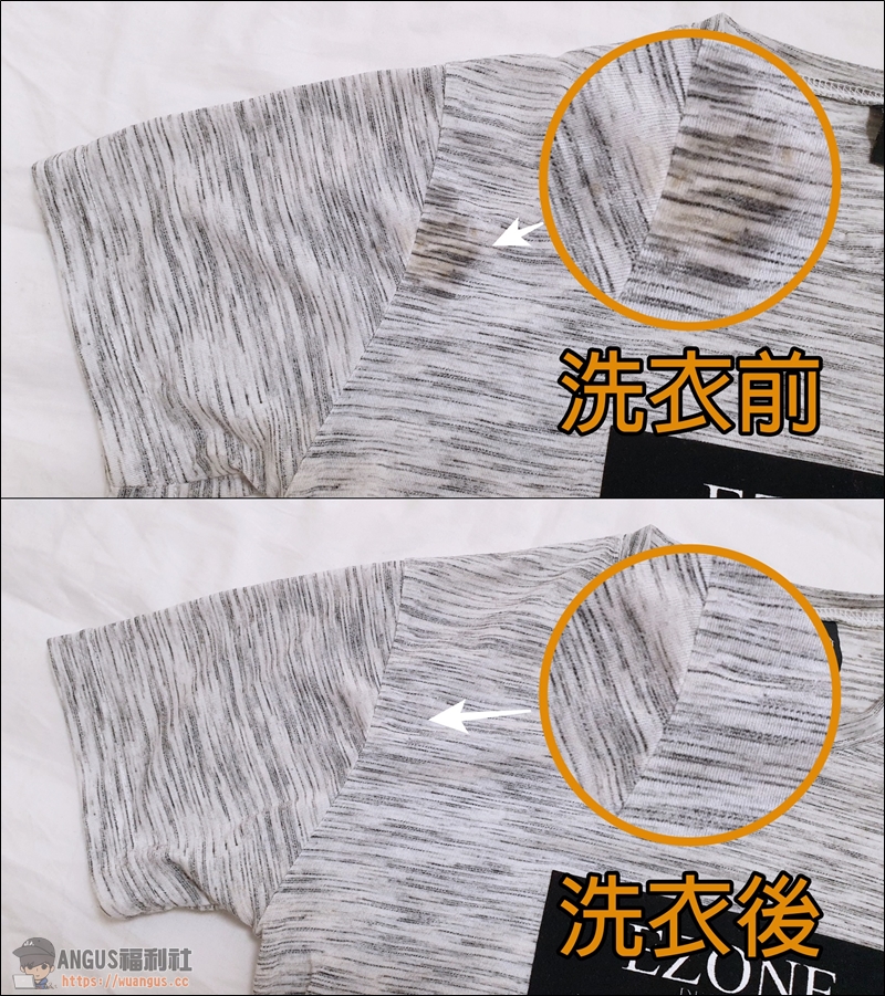 ▼ 特別拿出一件領口有嚴重泛黃的衣物,實際使用 40度奈米悠浮泡泡清洗,可以看到洗衣後的效果非常的好,原本有泛黃的領口都被「奈米悠浮泡泡」一併帶走,在其他衣物上的實際測試結果,也都有達到這樣的效果。