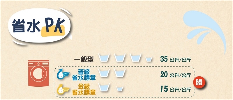 ▼ 看看一般型、普級省水標章、金級省水標章三種比較,可以很明顯就看出來省水差異真的非常的多,金級等於是比一般洗衣機省下多餘20公升的水量哦。