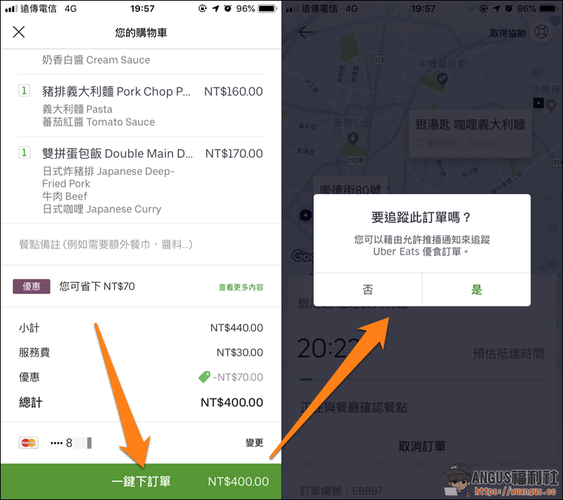 ▼ 最後結帳時後,會轉跳出「追蹤的訂單」透過通知也可以知道目前餐點在哪裡,點選畫面中的「是」就可以持續追蹤餐點。