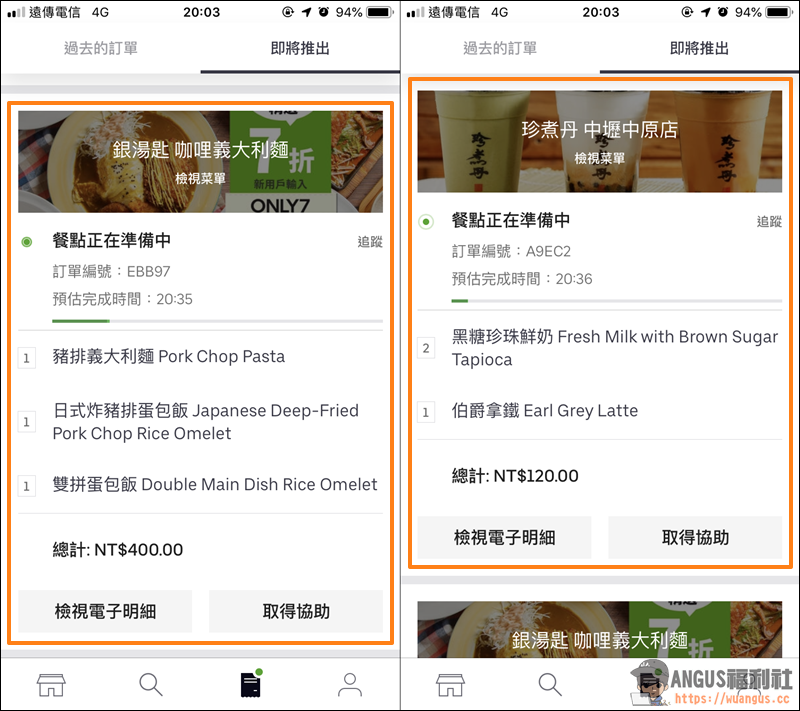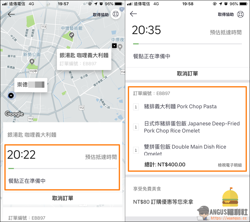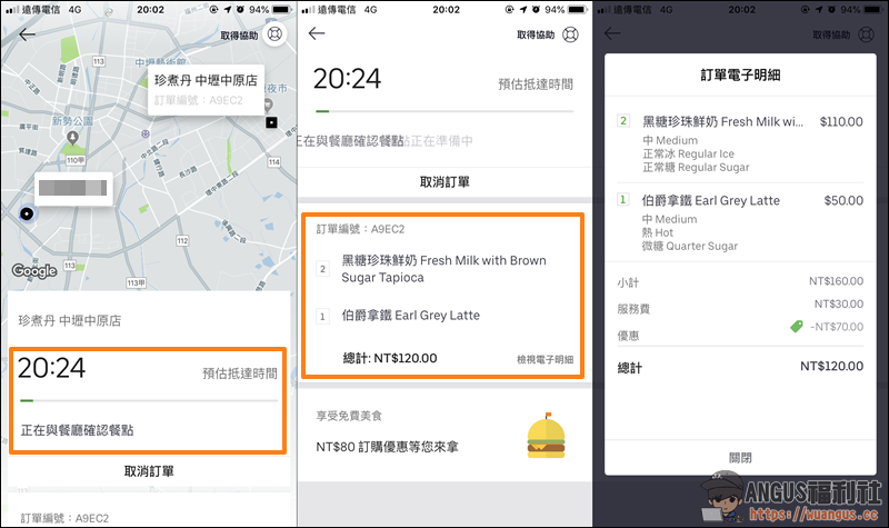 ▼ 在手機上就可以直接查看目前的「餐點狀況」,還有「預計抵達時間」是什麼時候,下方也會顯示剛剛點過的餐點明細,相當清楚哦。