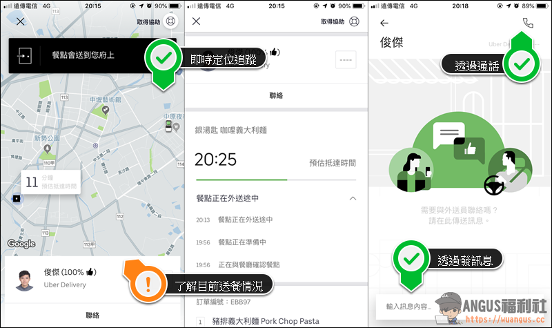 ▼ 可以的,只要在地圖上就可以看到配送人員的定位在哪,在配送上也會有人員的姓名與大頭照,如果想要直接跟配送人員聯繫,也可以透過「語音通話」與「訊息發送」的方式進行連絡。
