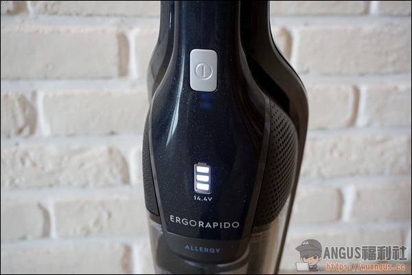 ▼ 在手持吸塵器上方有電池三段式指示燈號(額定電壓14.4V),官方資訊充電4小時,可使用中段:42分鐘 / 強力:16分鐘,而電池採用的是鋰電池。